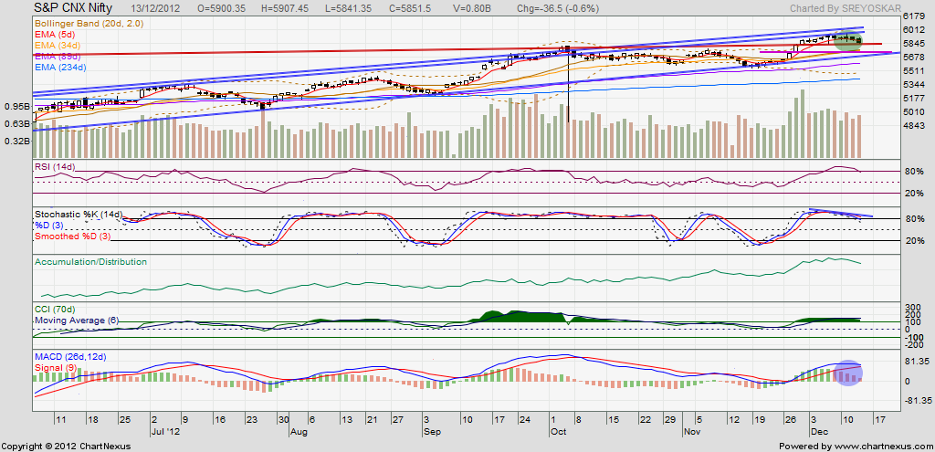 Those are long in NIFTY as per our suggestion (posted on Opening Bell of 03/12/12) may stay long with SL of 5850 (hourly closing).